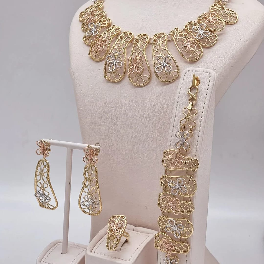 The ElegantRoseJewellery necklace set boasts a gold finish with delicate American diamond accents, ideal for a refined yet modern look. Its timeless design pairs well with both bridal and formal wear, adding a touch of luxury to any ensemble.