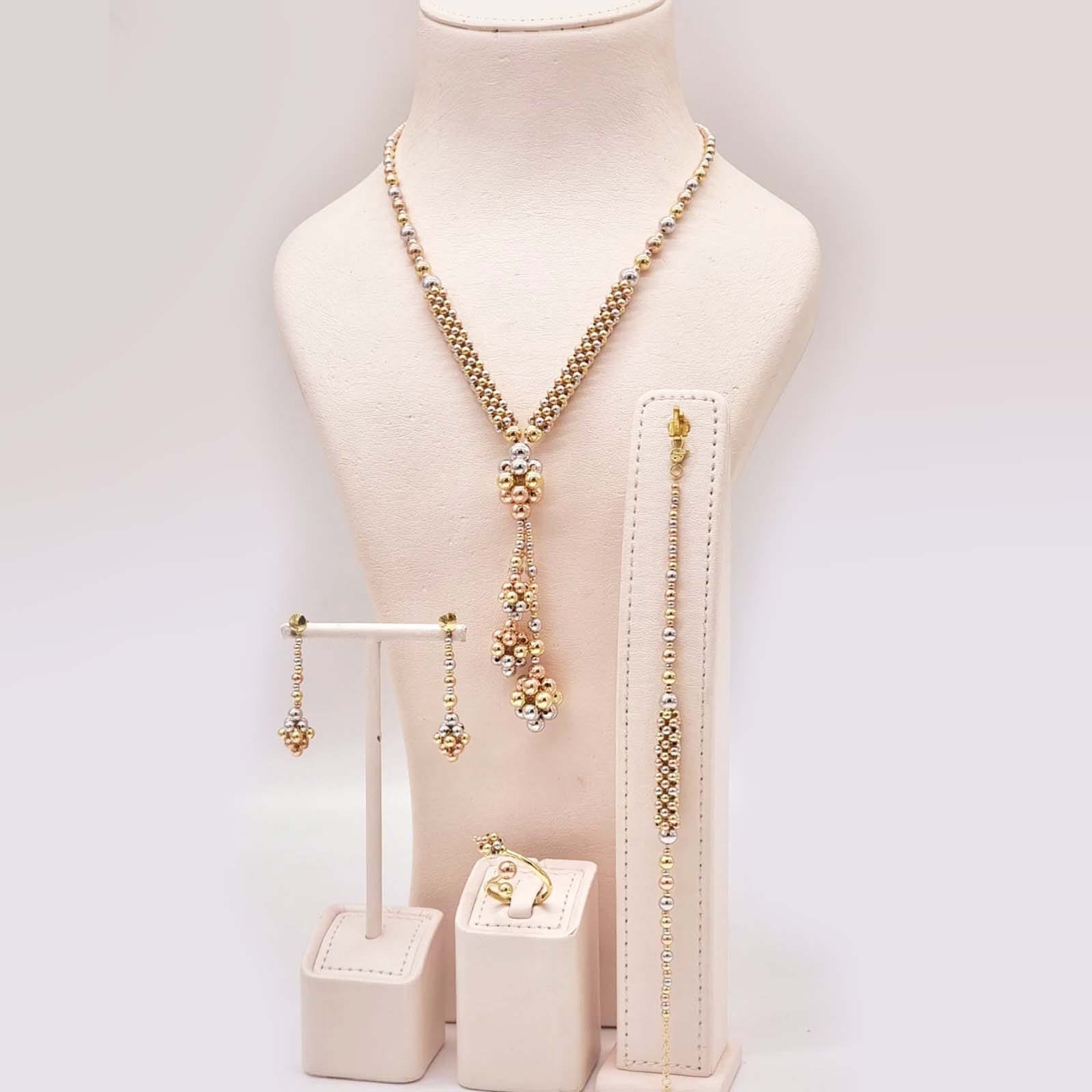 The ElegantRoseJewellery necklace set boasts a gold finish with delicate American diamond accents, ideal for a refined yet modern look. Its timeless design pairs well with both bridal and formal wear, adding a touch of luxury to any ensemble.