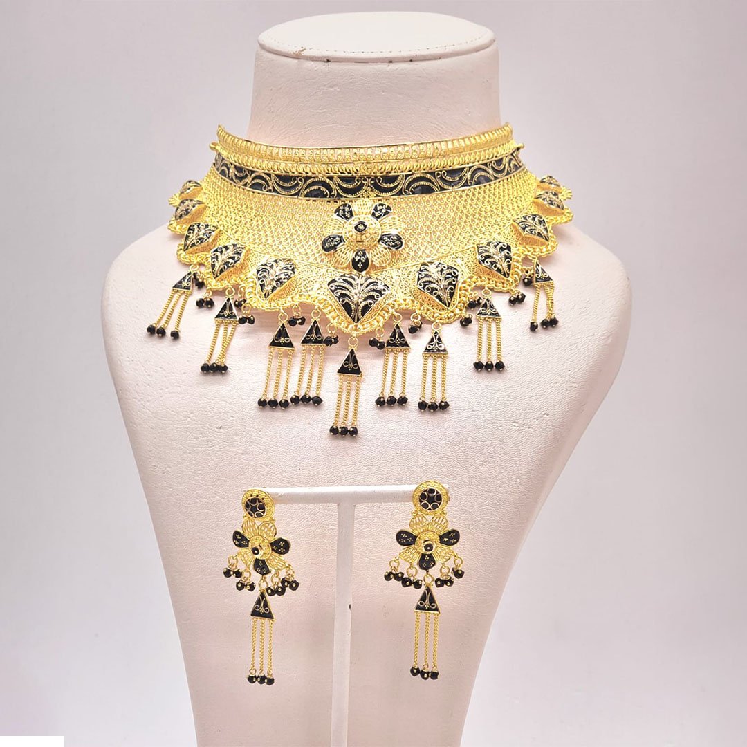 The ElegantRoseJewellery necklace set features a stunning gold plating with intricate designs, ideal for both traditional and modern styles.